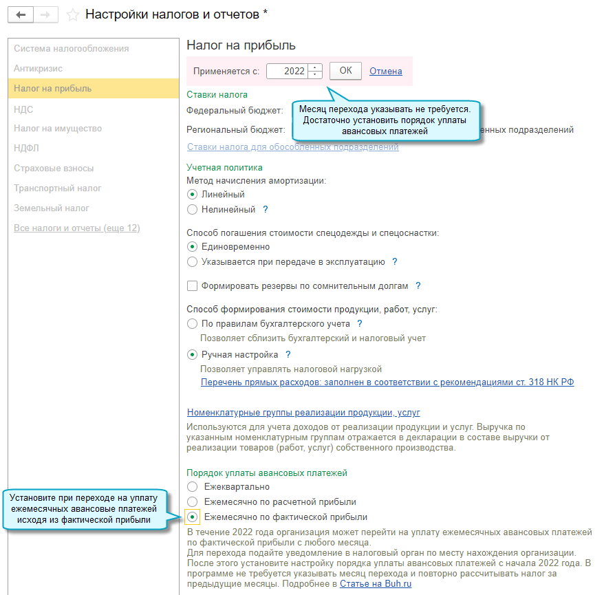 Добавлена возможность до конца 2022 года перейти с ежемесячной уплаты авансовых платежей по налогу на прибыль по расчетной прибыли на уплату авансовых платежей по фактической прибыли с любого месяца начиная с марта (Федеральный закон от 26.03.2022 № 67-ФЗ).