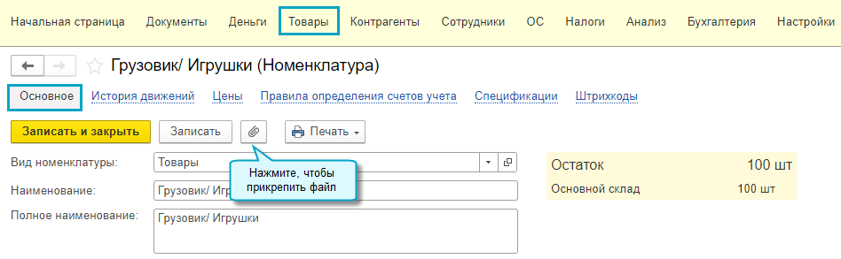 Полный интерфейс: меню "Справочники - Товары и услуги - Номенклатура".