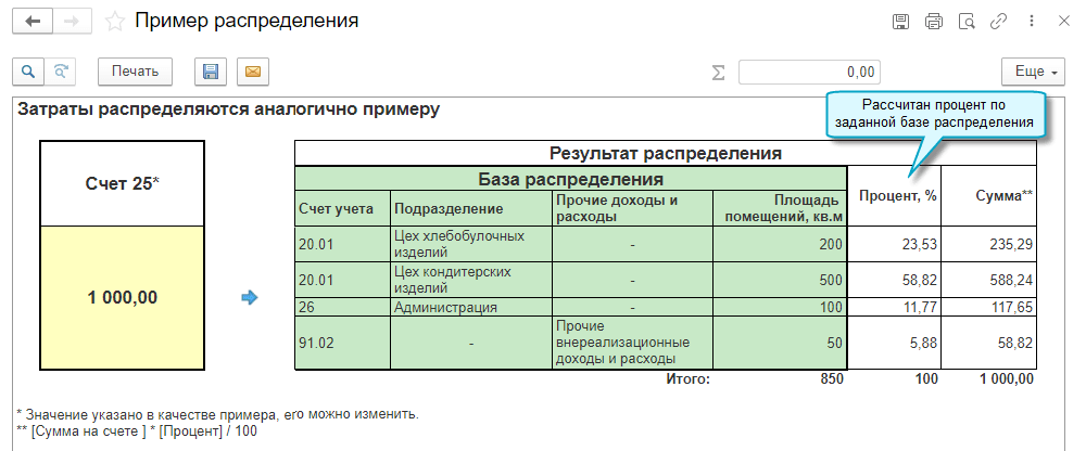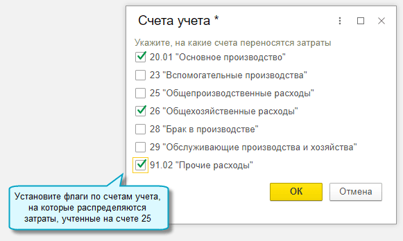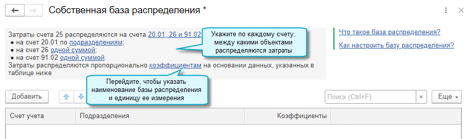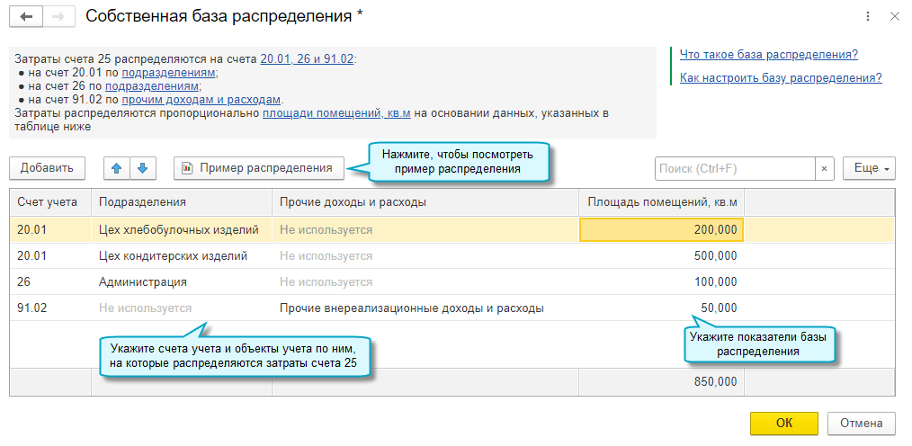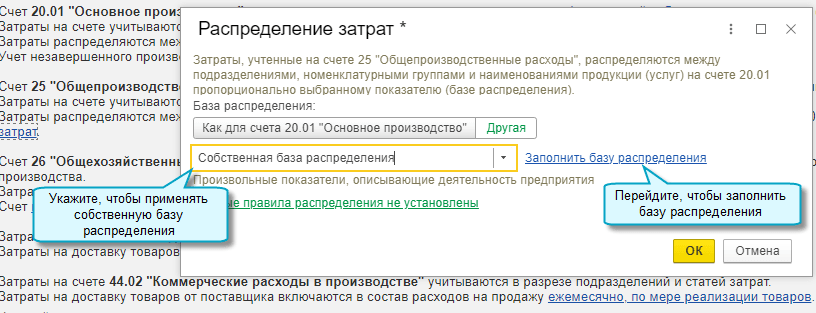 Добавлена возможность использовать собственную базу для распределения косвенных затрат, учтенных на счете 25 "Общепроизводственные расходы". Косвенные затраты могут распределяться на любые счета учета затрат, а также на счет 91.02 "Прочие расходы". Такой способ распределения предназначен для косвенных затрат с постоянной базой распределения. Например, затраты на аренду, отопление могут распределяется пропорционально площади помещений.