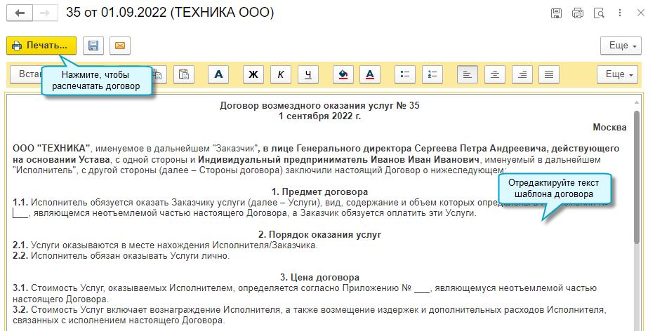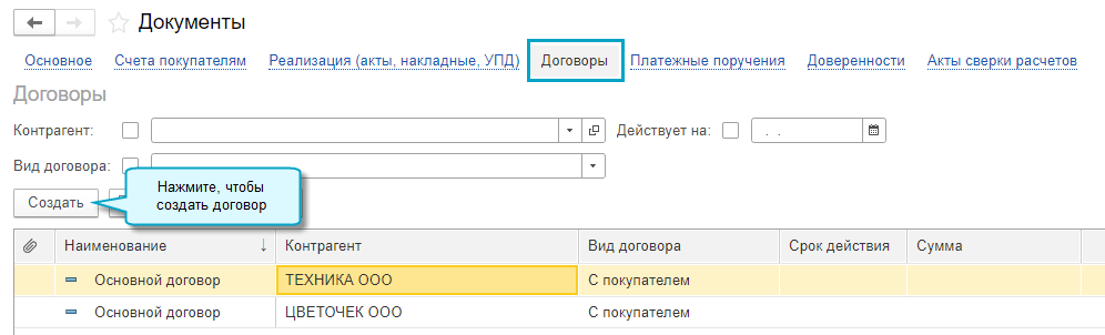 Простой интерфейс: меню "Документы - Договоры".