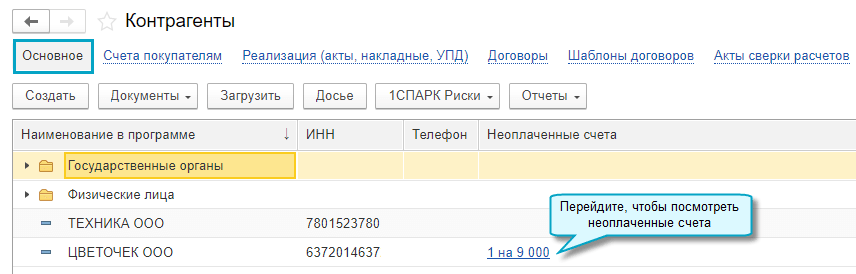 Простой интерфейс: меню "Контрагенты - Основное".