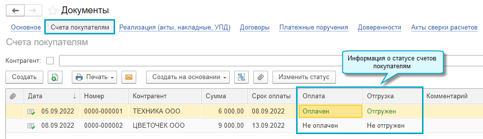 Простой интерфейс: меню "Документы - Счета покупателям".