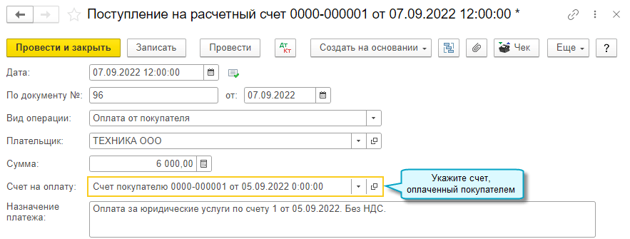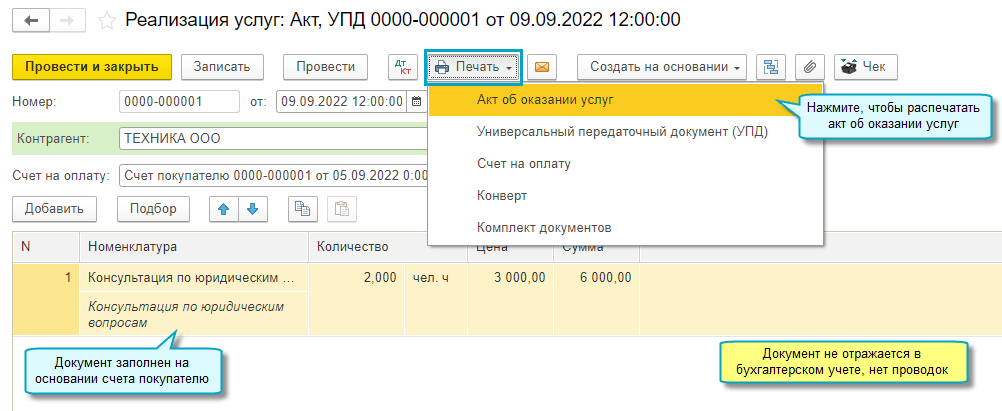 Добавлена возможность выставить покупателю счет, оформить договор, акт, накладную или УПД, когда организация отражает доходы и расходы по кассовым и банковским документам без закрывающих документов (кассовый метод).