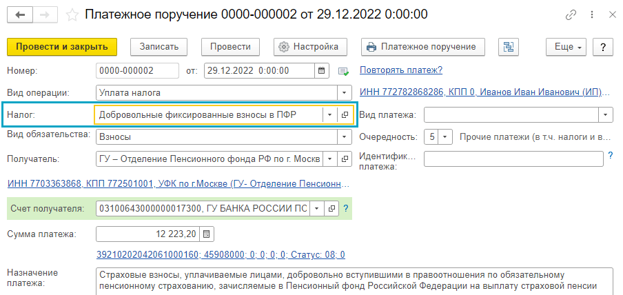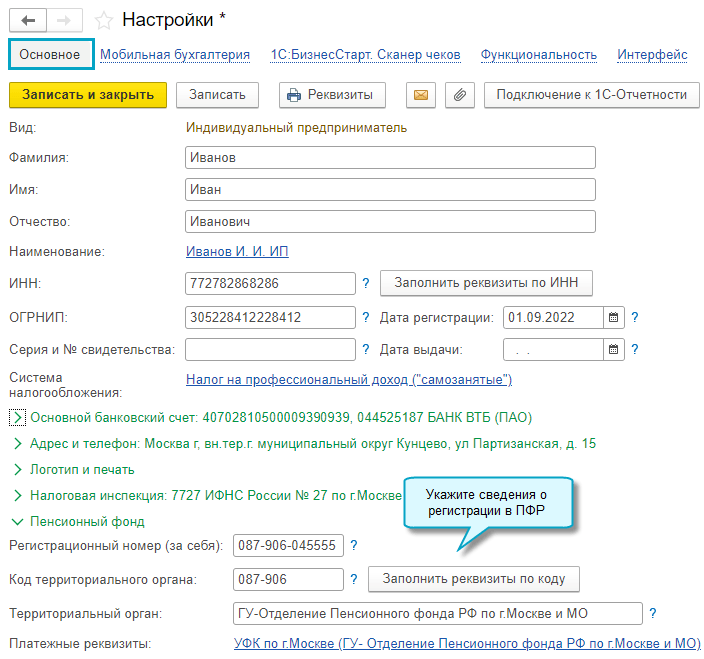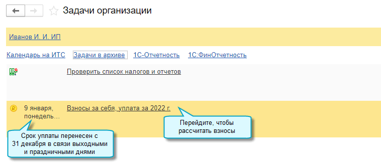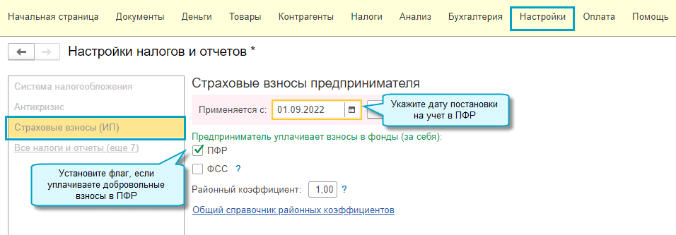Полный интерфейс: меню "Главное - Настройки - Налоги и отчеты - Страховые взносы (ИП)".