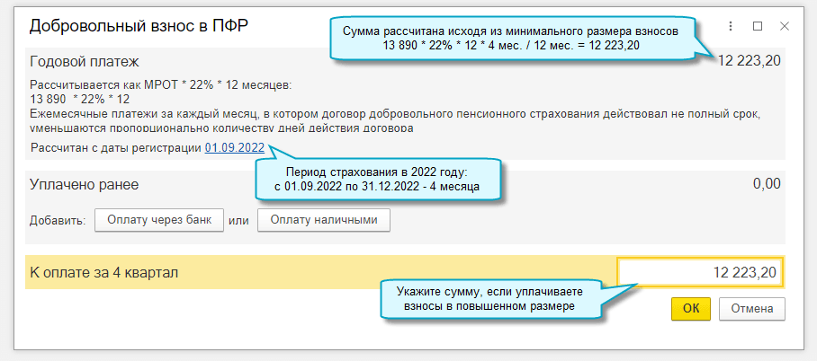 Добавлена возможность учитывать добровольные взносы в ПФР для самозанятых. Для их уплаты необходимо подать в ПФР заявление о добровольном вступлении в правоотношения по обязательному пенсионному страхованию. Законом установлены минимальный и максимальный размер взносов за год. За 2022 год - это 36 669 руб.60 коп. и 293 356 руб. 80 коп. Сумма уплаченных взносов влияет на размер пенсии по старости (статья 29 Федерального закона от 15.12.2001 № 167-ФЗ).