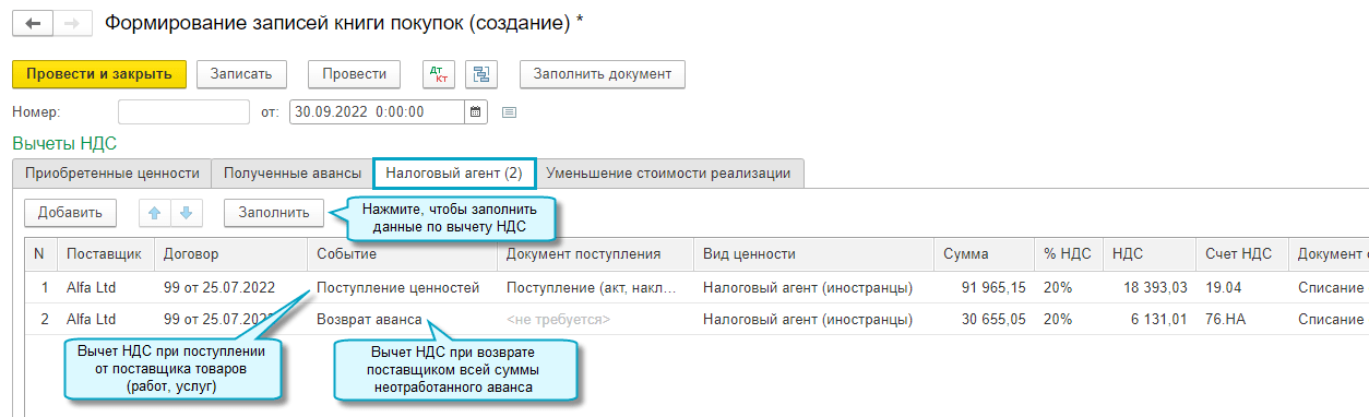 Добавлена возможность автоматически заполнить в книге покупок вычет НДС при возврате иностранным поставщиком всей суммы неотработанного аванса. К вычету принимается НДС, уплаченный организацией в качестве налогового агента при перечислении аванса иностранному поставщику.