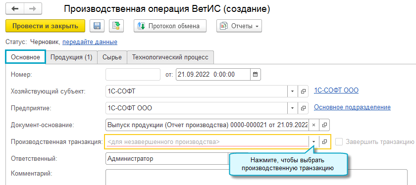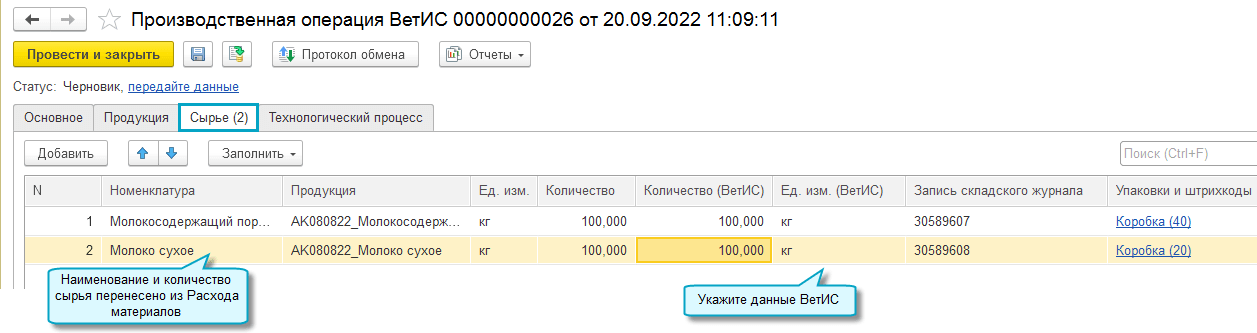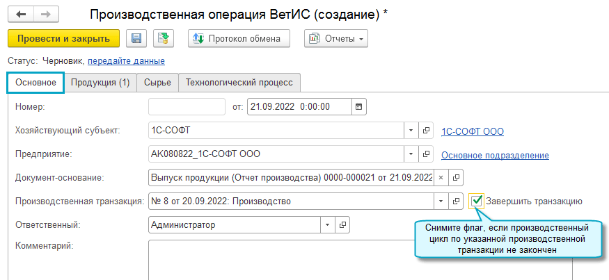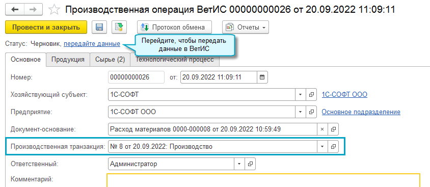 Добавлена возможность передавать в ВетИС данные о списании сырья в производство, не дожидаясь выпуска продукции. Такая передача требуется, например, при использовании сырья с малым сроком годности в длительных производственных циклах. Для связи исходного сырья и выпущенной продукции используется Производственная транзакция ВЕТИС.