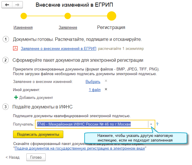 Добавлено автозаполнение кода налоговой инспекции, в которую отправляется пакет документов для электронной регистрации в ЕГРЮЛ или ЕГРИП. Налоговая инспекция подбирается по юридическому адресу организации, адресу места жительства индивидуального предпринимателя. Как правило, она не совпадает с налоговой инспекцией, в которую сдается отчетность.