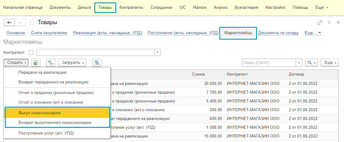 Полный интерфейс: меню "Продажи - Продажи - Маркетплейсы и комиссионеры - Выкуп комиссионером".