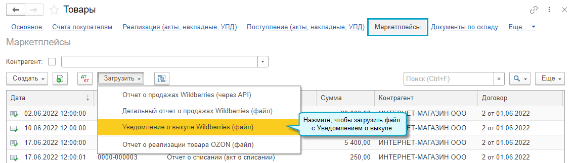 Для Wildberries добавлена возможность загрузки данных из файла с Уведомлением о выкупе.