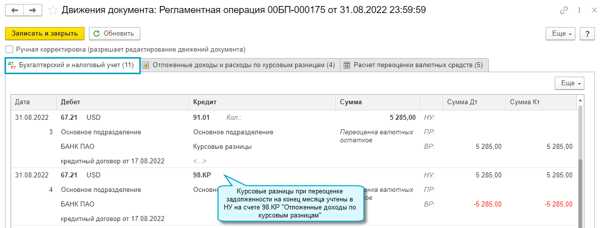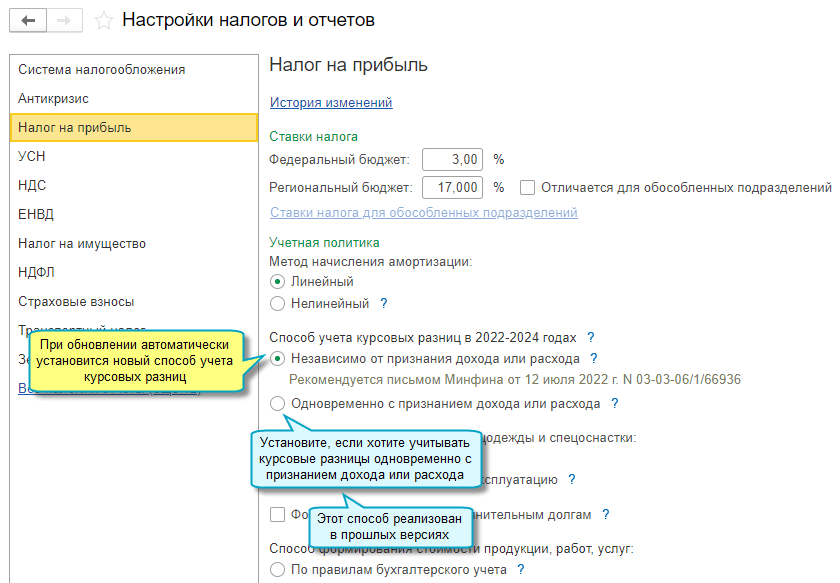 Добавлена возможность в 2022 - 2024 годах учитывать курсовые разницы по ежемесячной переоценке задолженности независимо от признания дохода или расхода для налога на прибыль.