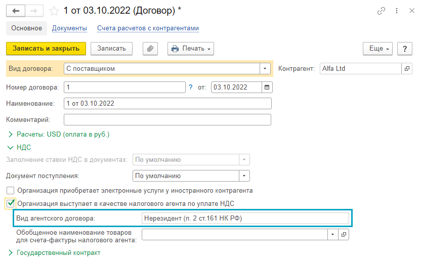 Добавлена загрузка и выгрузка вида агентского договора, по которому организация выступает в качестве налогового агента по уплате НДС, при обмене с другими программами. Функционал доступен, если другая программа также поддерживает формат обмена EnterpriseData 1.11.