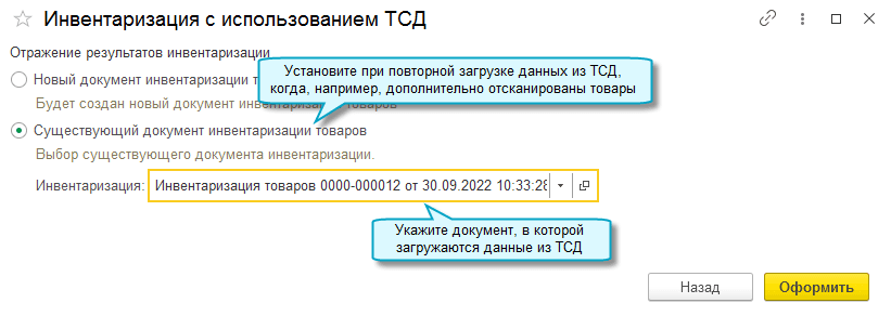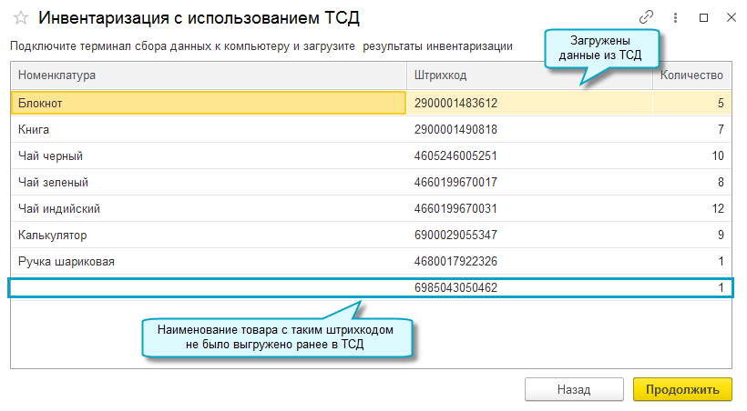 Добавлена возможность загрузить фактические остатки товаров со штрихкодами из терминала сбора данных (ТСД) в документ Инвентаризация товаров.