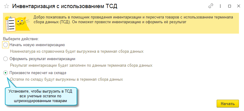 Также добавлена возможность выгрузить в ТСД остатки товаров со штрихкодами по данным учета, чтобы кладовщик мог сам произвести пересчет на складе при необходимости, без инвентаризации.