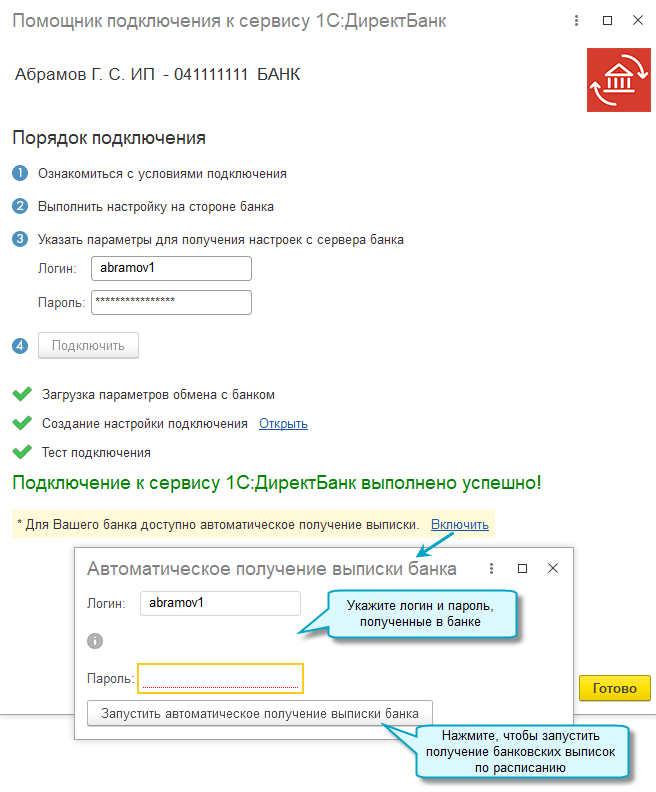 Аналогичная настройка выполняется при первичном подключении к сервису 1С:ДиректБанк, если банк поддерживает эту функцию: