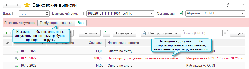 Документы, при загрузке которых было обнаружено, что не хватает данных для их заполнения и проведения в бухгалтерском учете, выделяются красным цветом.