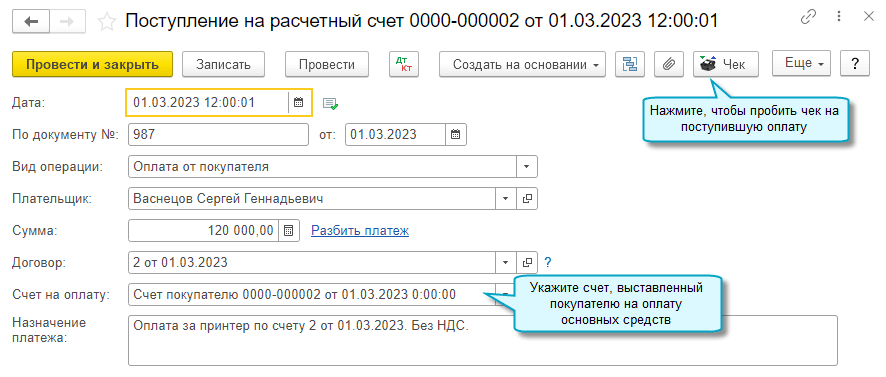 Добавлена возможность пробить кассовый чек при продаже основных средств. Поддержана продажа с получением предоплаты и с постоплатой. Чтобы кассовый чек автоматически формировался с корректным Признаком способа расчета, требуется документы оплаты и передачи основных средств оформлять на основании счета на оплату.