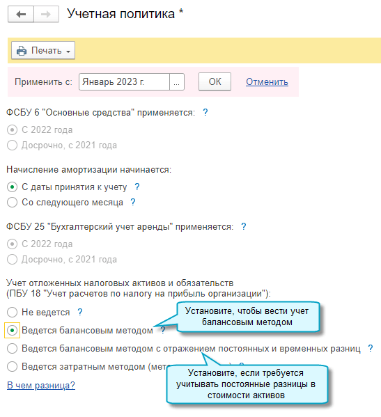 Чтобы перейти на ведение учета актуальным балансовым методом сразу, начиная с первого года перехода на редакцию 3.0, требуется самостоятельно выполнить настройку учетной политики: