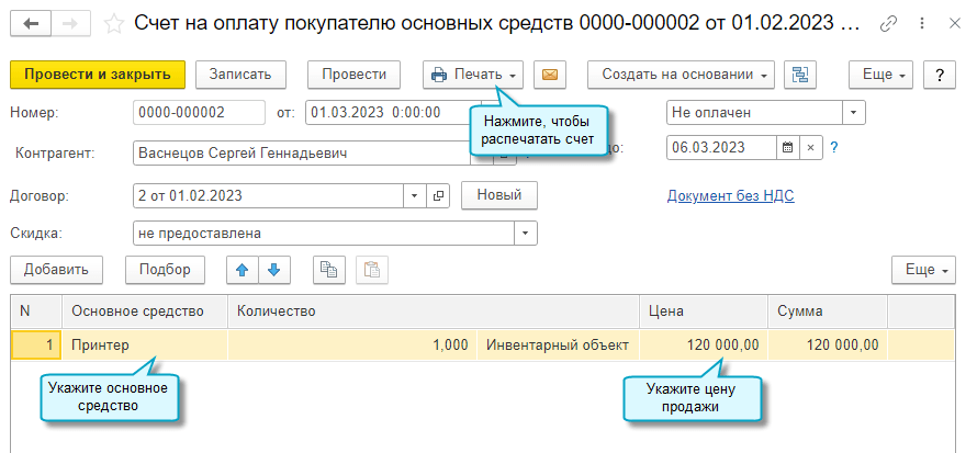 Добавлена возможность выставить покупателю счет при продаже основных средств.