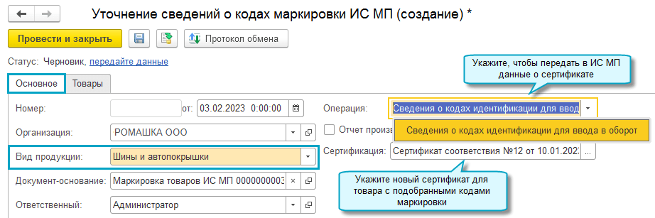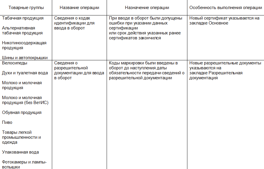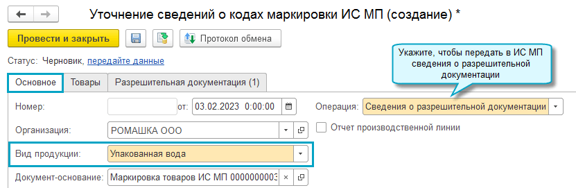 Для уточнения сведений о разрешительной документации используется документ "Уточнение сведений о кодах маркировки ИС МП" с указанием операции "Сведения о кодах идентификации для ввода в оборот" или "Сведения о разрешительной документации для ввода в оборот". Выбор операции зависит от товарной группы.