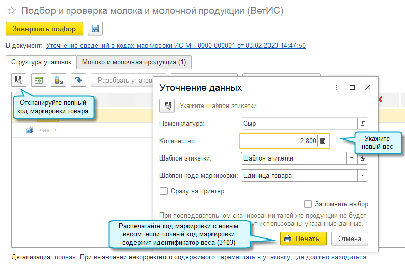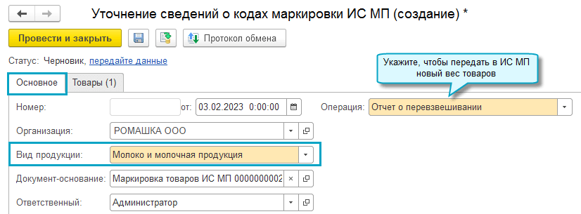 Для уточнения веса весовой молочной продукции используется документ "Уточнение сведений о кодах маркировки ИС МП" с указанием операции "Отчет о перевзвешивании". Операция доступна для товарных групп Молоко и молочная продукция и Молоко и молочная продукция (без ВетИС).