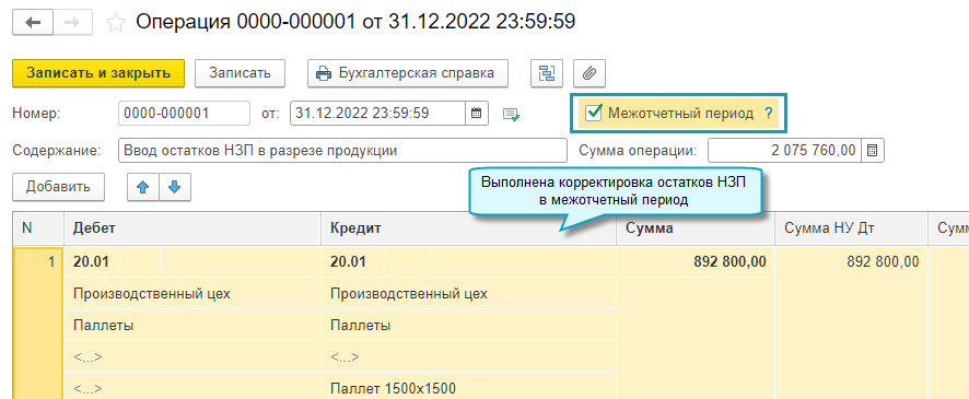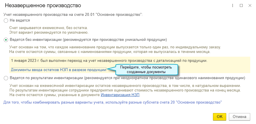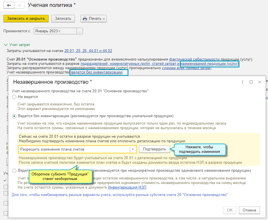 Упрощен переход на учет незавершенного производства c детализацией до продукции. Функционал предназначен для организаций, которые в прошлые годы учитывали затраты на счете 20.01 в разрезе продукции, а теперь намерены вести в разрезе продукции еще и учет незавершенного производства. При таком изменении учетной политики требуется на дату перехода скорректировать данные об остатках на счете 20.01, сформировавшиеся за прошлые годы - выполнить ввод остатков. Такой ввод остатков необходим, вне зависимости от того, учитывала ранее организация незавершенное производство или нет. Теперь он выполняется автоматически при настройке учета затрат в Учетной политике.