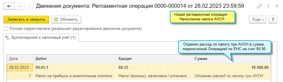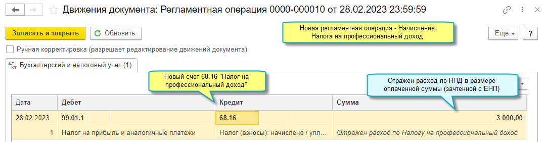 Скорректирован порядок начисления налога на профессиональный доход, в связи с тем, что с 01.01.2023 налог перечисляется по реквизитам единого налогового платежа (ЕНП) на единый налоговый счет. Для учета расчетов добавлен счет 68.16 "Налог на профессиональный доход".