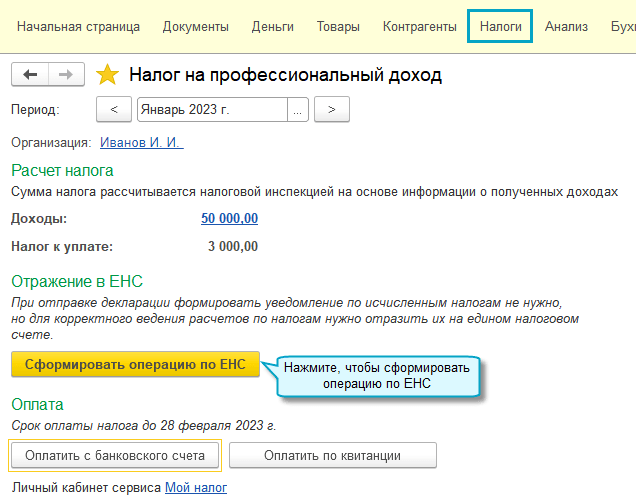 Полный интерфейс: меню "Операции - Закрытие периода - Закрытие месяца - Начисление Налога на профессиональный доход".