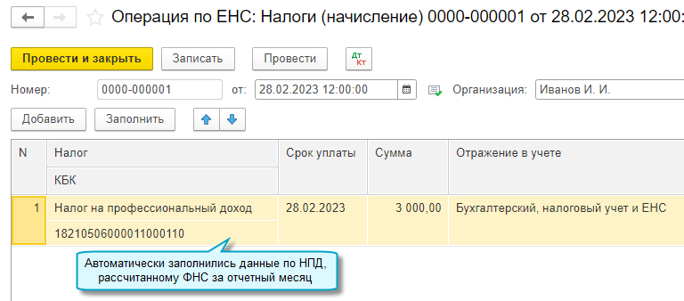 Простой интерфейс: меню "Бухгалтерия - Закрытие периода - Закрытие месяца - Начисление Налога на профессиональный доход".