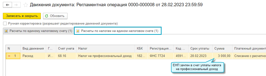 Зачет ЕНП выполняется регламентной операцией при закрытии месяца при условии наличия средств на едином налоговом счете, по сроку уплаты: