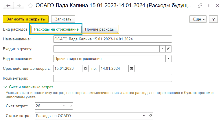 Аналогично заполняется справочник по другим видам страхования, например, по расходам на ОСАГО.