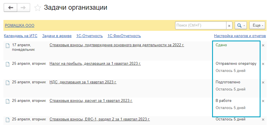 Теперь достаточно открыть список задач, чтобы увидеть все этапы сдачи отчетности: в работе, подготовлено, отправлено оператору и т.п.