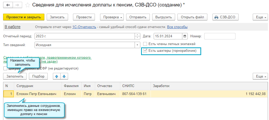 Добавлена возможность подготовить форму Сведения для исчисления доплаты к пенсии, СЗВ-ДСО. Ее представляют один раз в год работодатели, которые используют труд членов летных экипажей воздушных судов гражданской авиации или относятся к угольной промышленности и имеют рабочие места с правом на ежемесячную доплату к пенсии. Впервые подать СЗВ-ДСО необходимо не позднее 25 января 2024 года за 2023 год. Подробнее...