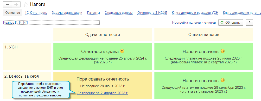 Полный интерфейс: меню "Главное - Настройки - Налоги и отчеты - Страховые взносы".