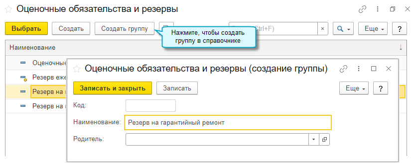 Добавлена возможность группировать в справочнике оценочные обязательства и резервы. Это помогает организовать более наглядный учет по их видам.
