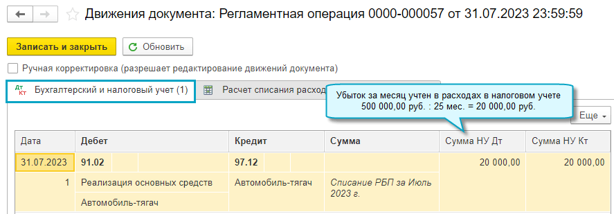 Такой расчет срока применяется при списании убытков, учтенных в налоговом учете на счете 97.12 "Убытки от реализации основных средств" автоматически при передаче основного средства.