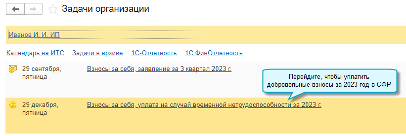 Добавлена задача по уплате индивидуальным предпринимателем добровольных взносов на социальное страхование в Социальный фонд России (СФР) со сроком выполнения не позднее последнего рабочего дня в календарном году.