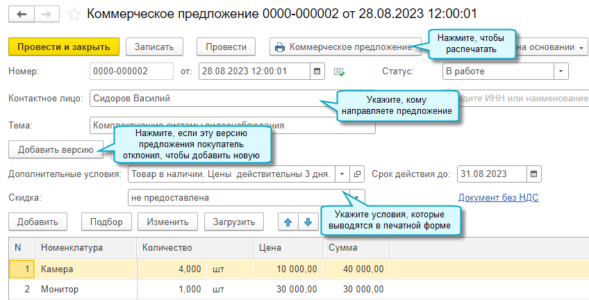 Добавлена возможность оформить коммерческое предложение для покупателя. В процессе согласования условий можно добавлять и сохранять его разные версии.