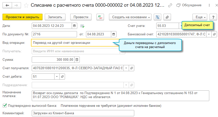 Также автоматически в список банковских счетов организации добавляется депозитный счет, если для каждого депозита банком открывается счет.