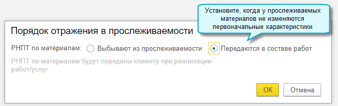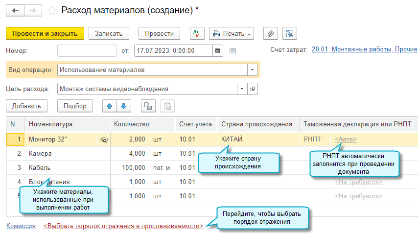 Добавлена возможность передавать от подрядчика заказчику РНПТ по прослеживаемым материалам, использованным при выполнении работ. Это относится к материалам, которые не теряют своих первоначальных характеристик в результате выполнения работ. РНПТ заполняются в счет-фактуре и УПД согласно рекомендациям ФНС (Письмо ФНС России от 22.12.2021 N СД-4-15/17982@, Письмо ФНС России от 21.02.2023 № ЗГ-3-15/2580@). Подробнее...