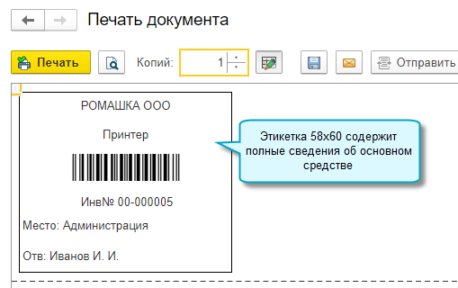 Для этого потребуется сначала распечатать и наклеить на основные средства инвентарные этикетки со штрихкодами. При инвентаризации достаточно будет отсканировать эти штрихкоды терминалом сбора данных, чтобы загрузить фактические остатки основных средств в документ Инвентаризация ОС.