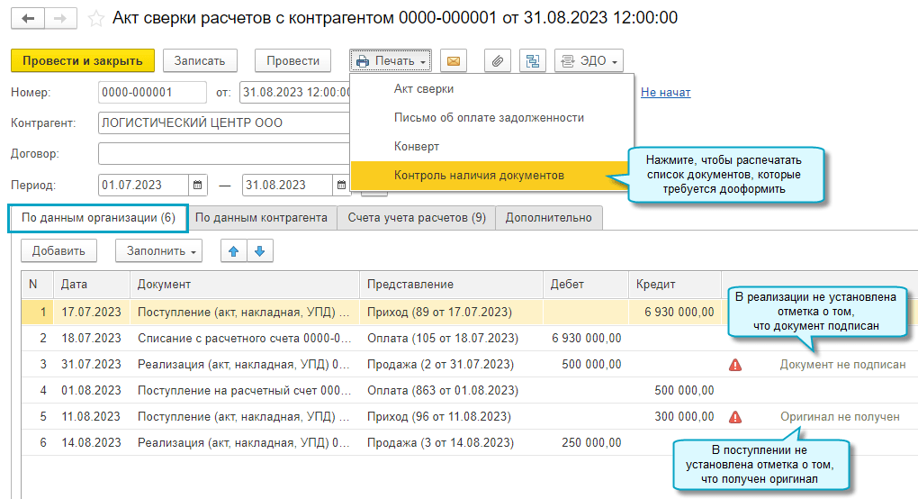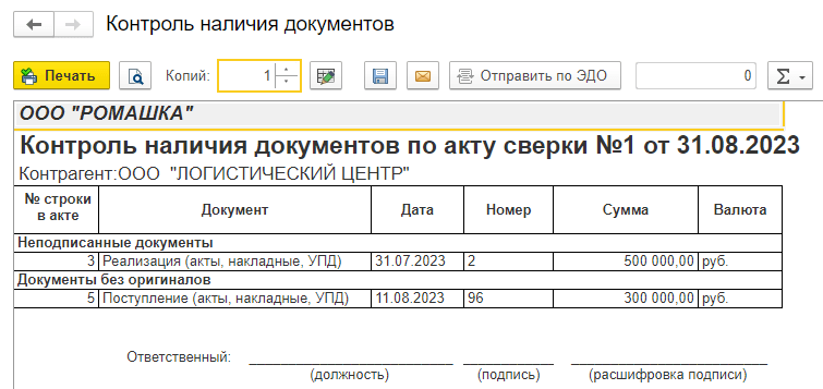 Добавлена возможность в акте сверки увидеть и распечатать список не подписанных покупателями реализаций и не полученных от поставщиков оригиналов документов.