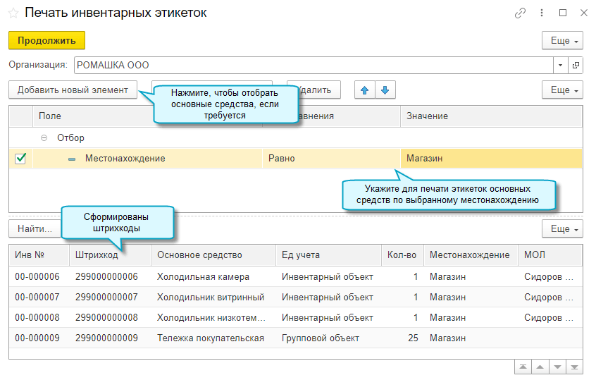 Добавлена возможность распечатать инвентарные этикетки со штрихкодами сразу по всем или отобранным основным средствам. Функционал доступен в полном интерфейсе.