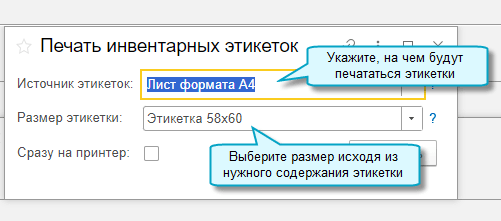 Полный интерфейс: меню "ОС и НМА - Сервис - Печать инвентарных этикеток"