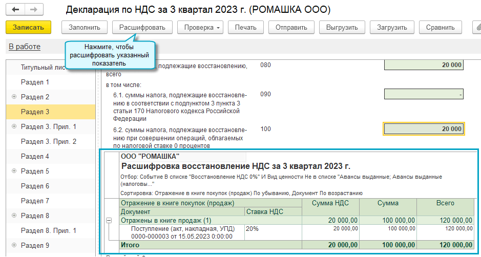 Добавлена возможность автозаполнения строки 100 «суммы налога, подлежащие восстановлению при совершении операций, облагаемых по налоговой ставке 0 процентов» и строки 125 "сумма налога, предъявленная подрядными организациями (застройщиками, техническими заказчиками) по выполненным работам при проведении капитального строительства" раздела 3 декларации по НДС.