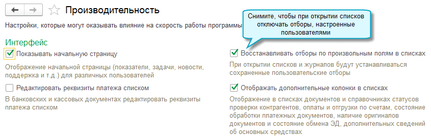 Добавлена возможность ускорить открытие списков документов и журналов. Для этого организациям с большим количеством документов рекомендуется отключить использование отборов, настроенных ранее пользователями. Сделать это может пользователь с правами администратора.