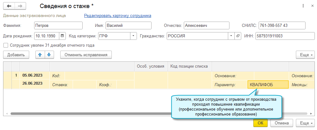 Добавлена возможность заполнять коды КВАЛИФОБ и КВАЛИФОЦ в подразделе 1.2 "Сведения о страховом стаже" раздела 1 формы ЕФС-1 (Постановление Правления ПФР от 31.10.2022 № 245п).