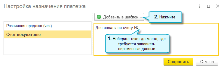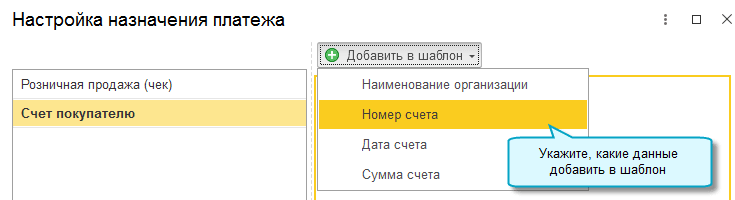 Автоматически при оплате по счету передается такое назначение - "Оплата через СБП по счету № ... от .... Сумма ...", чтобы передавать покупателю другое назначение, выполните следующие настройки: