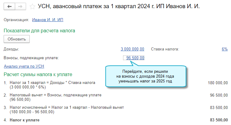 Добавлена возможность индивидуальным предпринимателям уменьшить налог при УСН "доходы" за 2024 год на страховые взносы, рассчитанные с доходов за 2024 год. Тогда эти страховые взносы не будут учитываться при уменьшении налога в 2025 году (Письмо ФНС России от 08.04.2024 № СД-4-3/4104@).