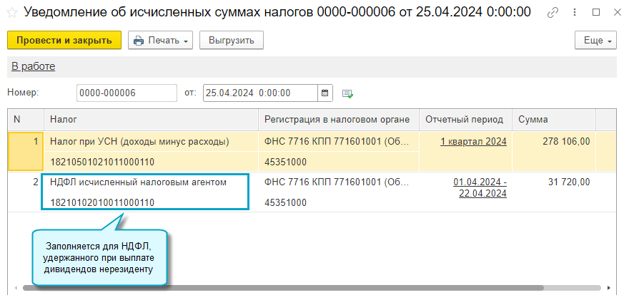 С 01.01.2024 для НДФЛ с дивидендов, выплаченных нерезидентам, применяется КБК 182 1 01 02010 01 1000 110. Он заполняется в уведомлениях об исчисленных суммах налогов и в форме 6-НДФЛ (Письмо ФНС России от 01.03.2024 № БС-2-11/3034@). Подробнее ...